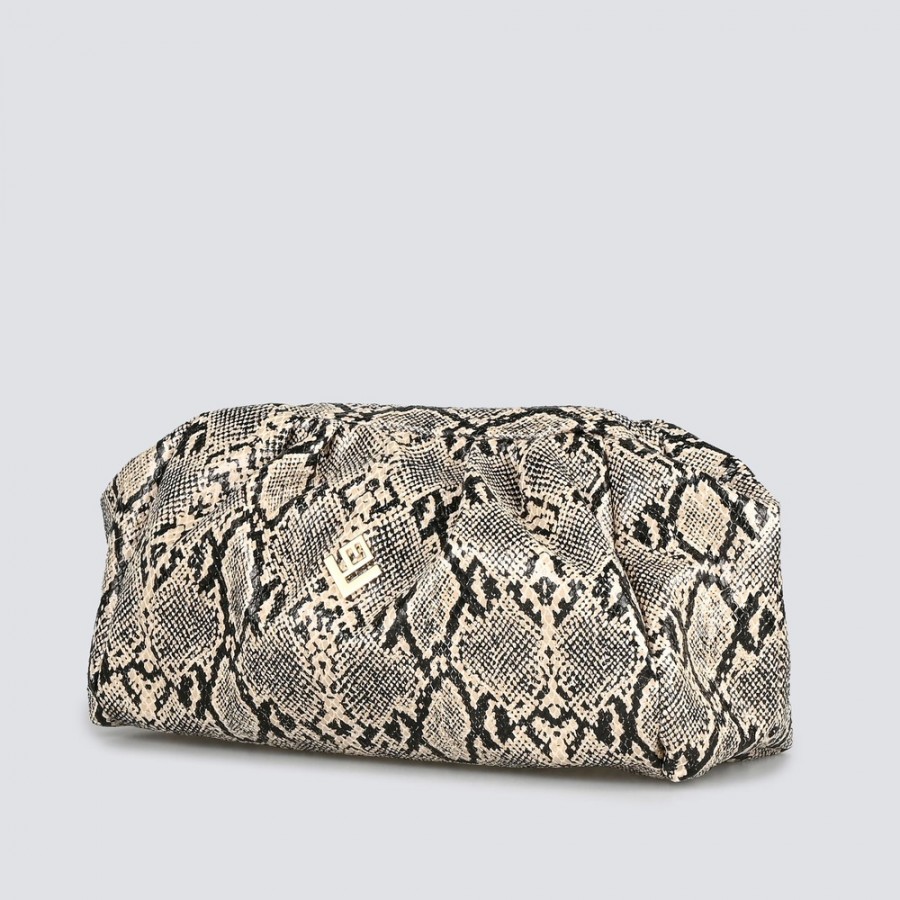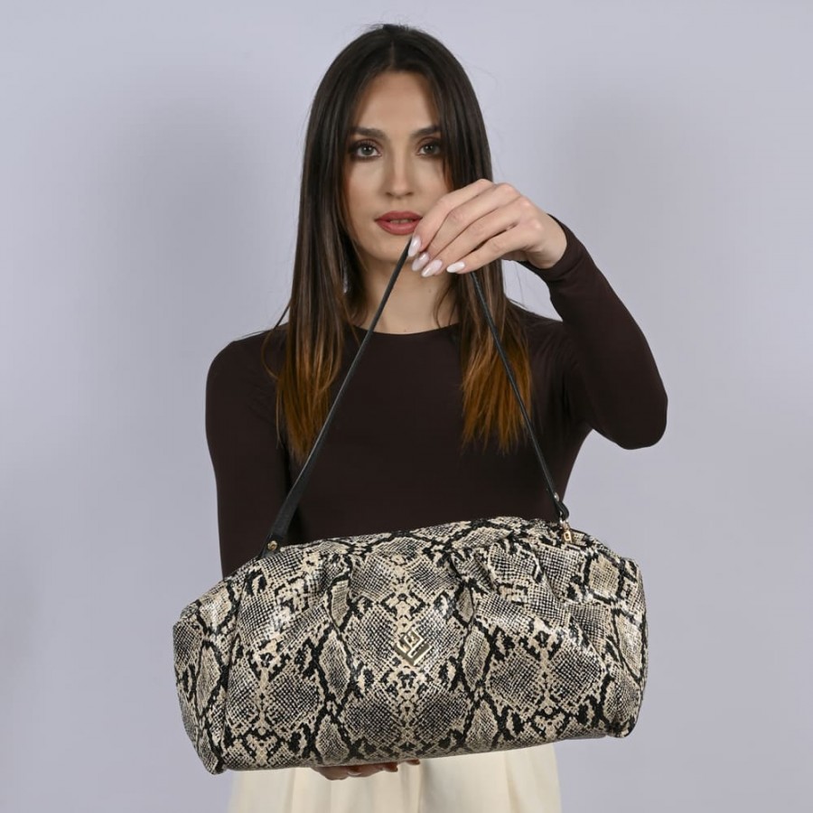 Η Paris είναι σχεδιασμένη για να βγάζει την πιο ανέμελη αλλά συγχρόνως και την πιο elegant πλευρά σου. Οι κομψές γραμμές της συναντούν το συνθετικό ανάγλυφο δέρμα με snake print της Feral. Ο μοναδικός της χαρακτήρας θα σε ενθουσιάσει.Μπορείς να την κρατήσεις και στον ώμο με τον δερμάτινο ιμάντα που τη συνοδεύει. Στο εσωτερικό της θα βρεις υφασμάτινη φόδρα και μία εσωτερική τσέπη .