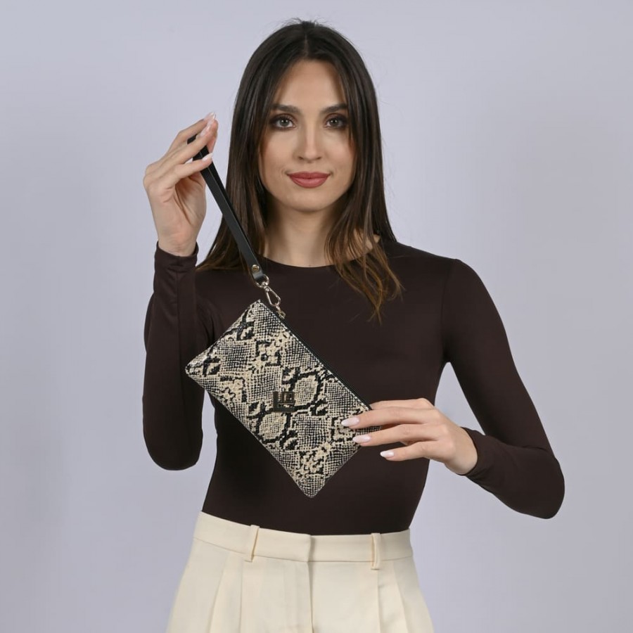 Ένα χαρακτηριστικό πορτοφόλι , εμπνευσμένο από την ιδιαίτερη αισθητική της Feral συλλογής. Κατασκευασμένο από συνθετικό ανάγλυφο δέρμα με snake print. Κλείσιμο με φερμουάρ ενώ μπορείς να το κρατήσεις και από το μικρό δερμάτινο χερούλι του.