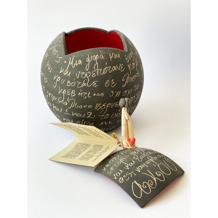 Μια επαφή με το χρόνο που γεννά την πρώτη ύλη - αυτό είναι ο πηλός. Η υγρασία της γης, εύπλαστη μάζα, πρόθυμη να ακολουθήσει όποιο σχήμα επιθυμείς. Συνδυασμένη με τη φωτιά η όψη της αλλάζει, γίνεται τραχιά, σταθερή, έτοιμη να φιλοξενήσει το συναίσθημα του τελικού αποδέκτη.