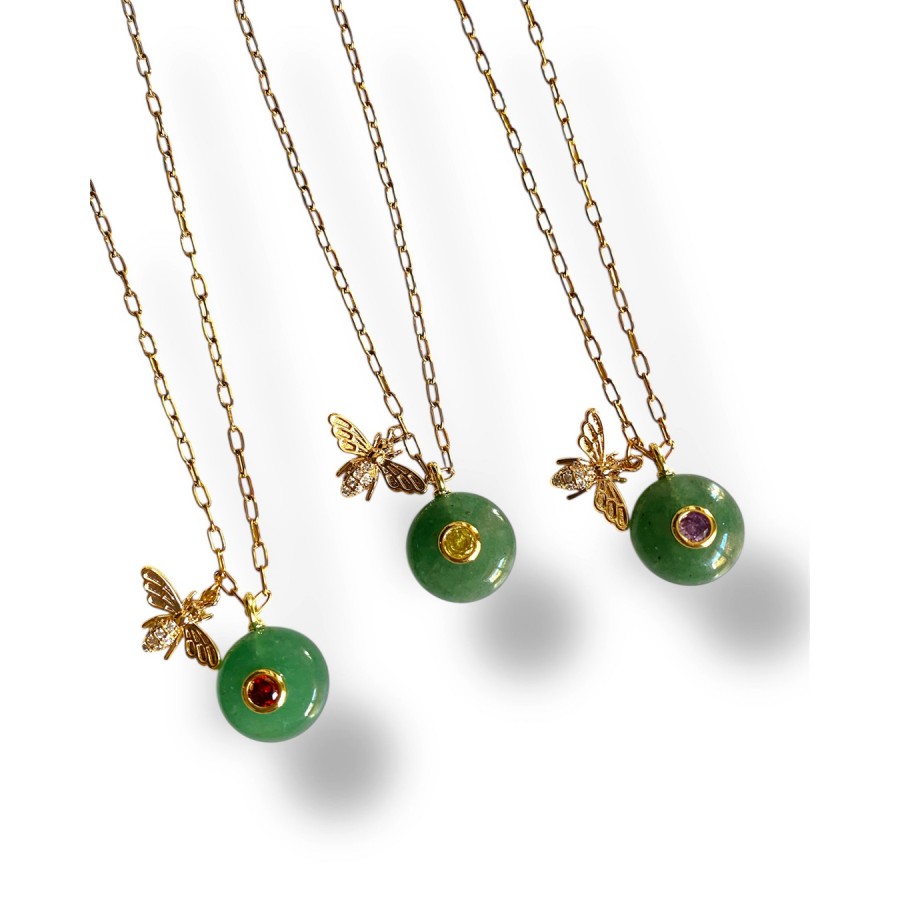 Χειροποίητο κολιέ με φυσικό πολύτιμο λίθο σε πράσινο χρώμα με ζιργκόν & μέλισσα , αλυσίδα από ανοξείδωτο ατσάλι.