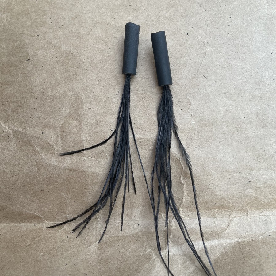 Χειροποίητα κρεμαστά σκουλαρίκια από πολυμερικό πηλό και χρωματιστά πούπουλα.
